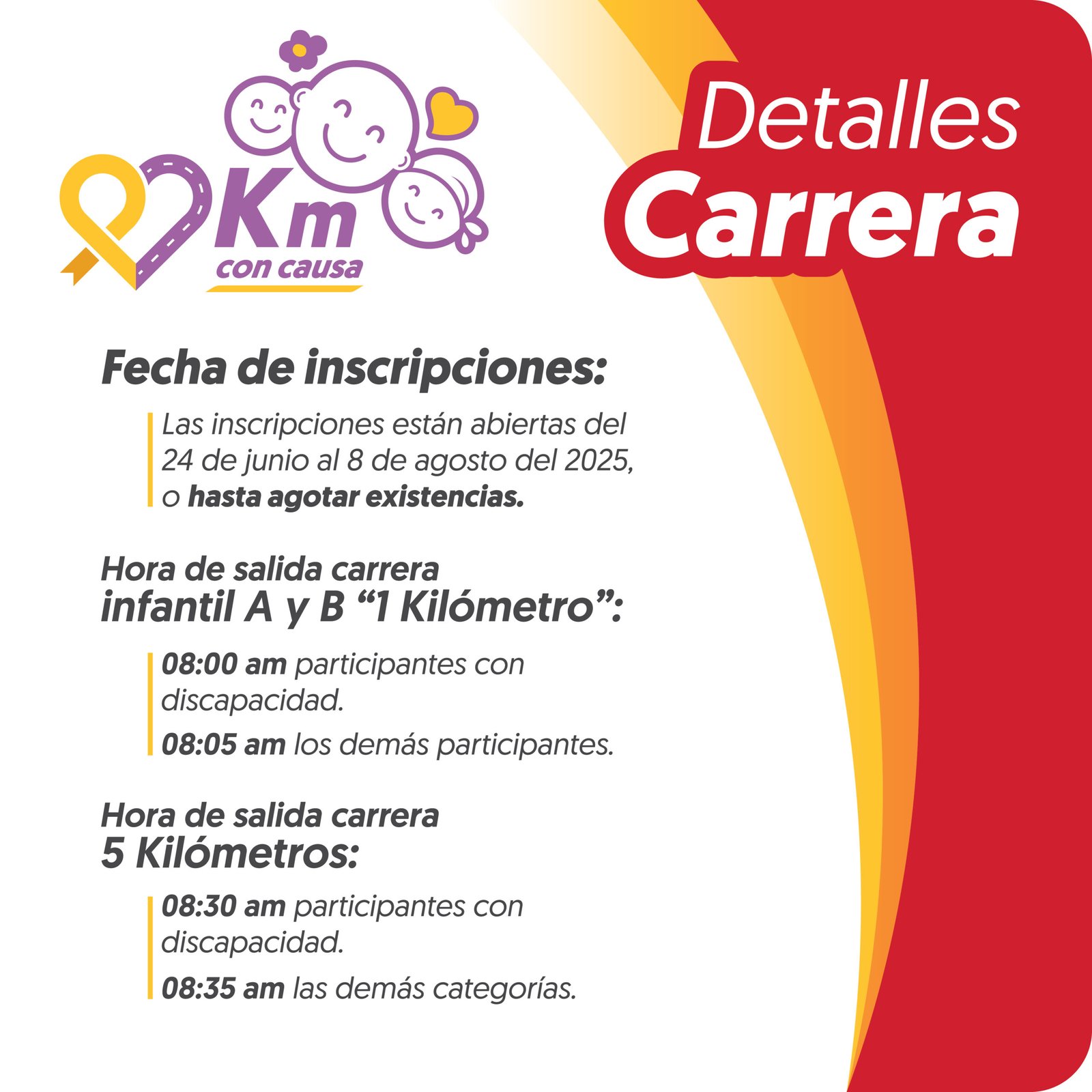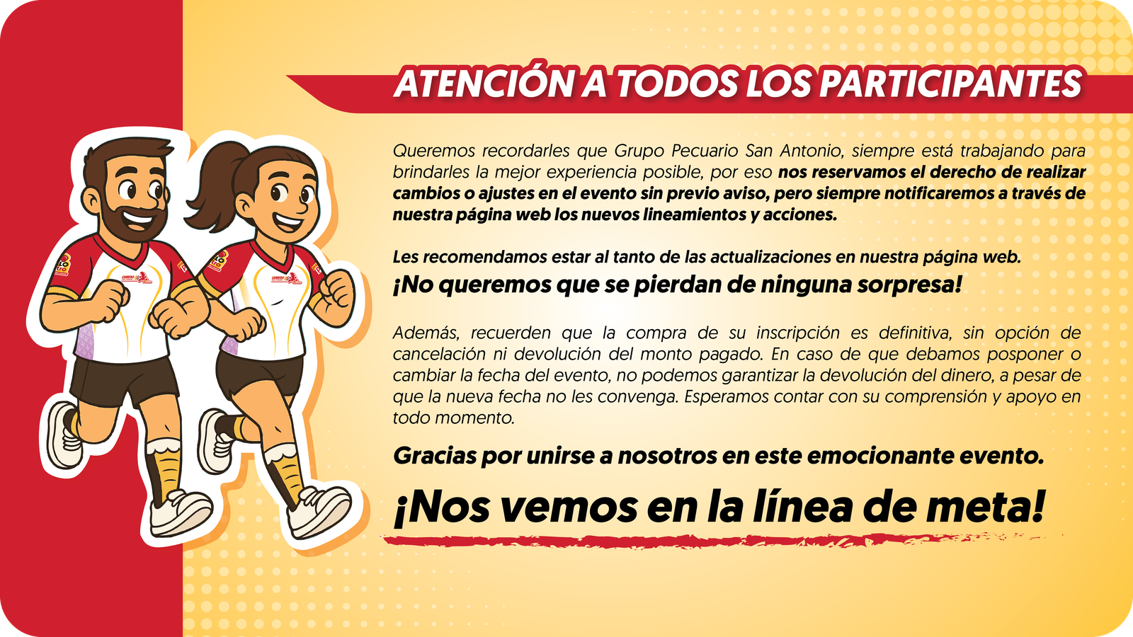Si no puedes acudir a recoger tu kit de corredor en la fecha y hora indicadas, perderás el derecho a recogerlo y a ser elegible para participar por nuestros premios ¡No te lo pierdas, asegúrate de acudir en tiempo y forma! 🏃🏻♂️🎁